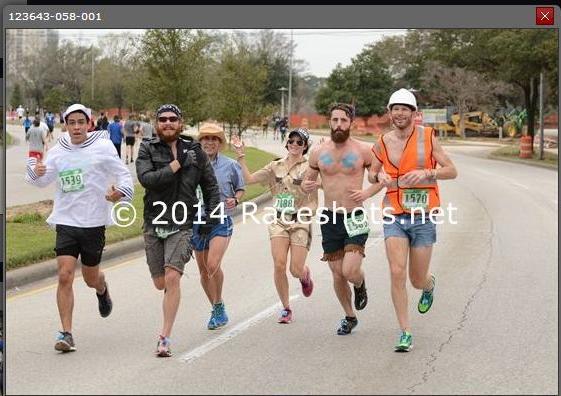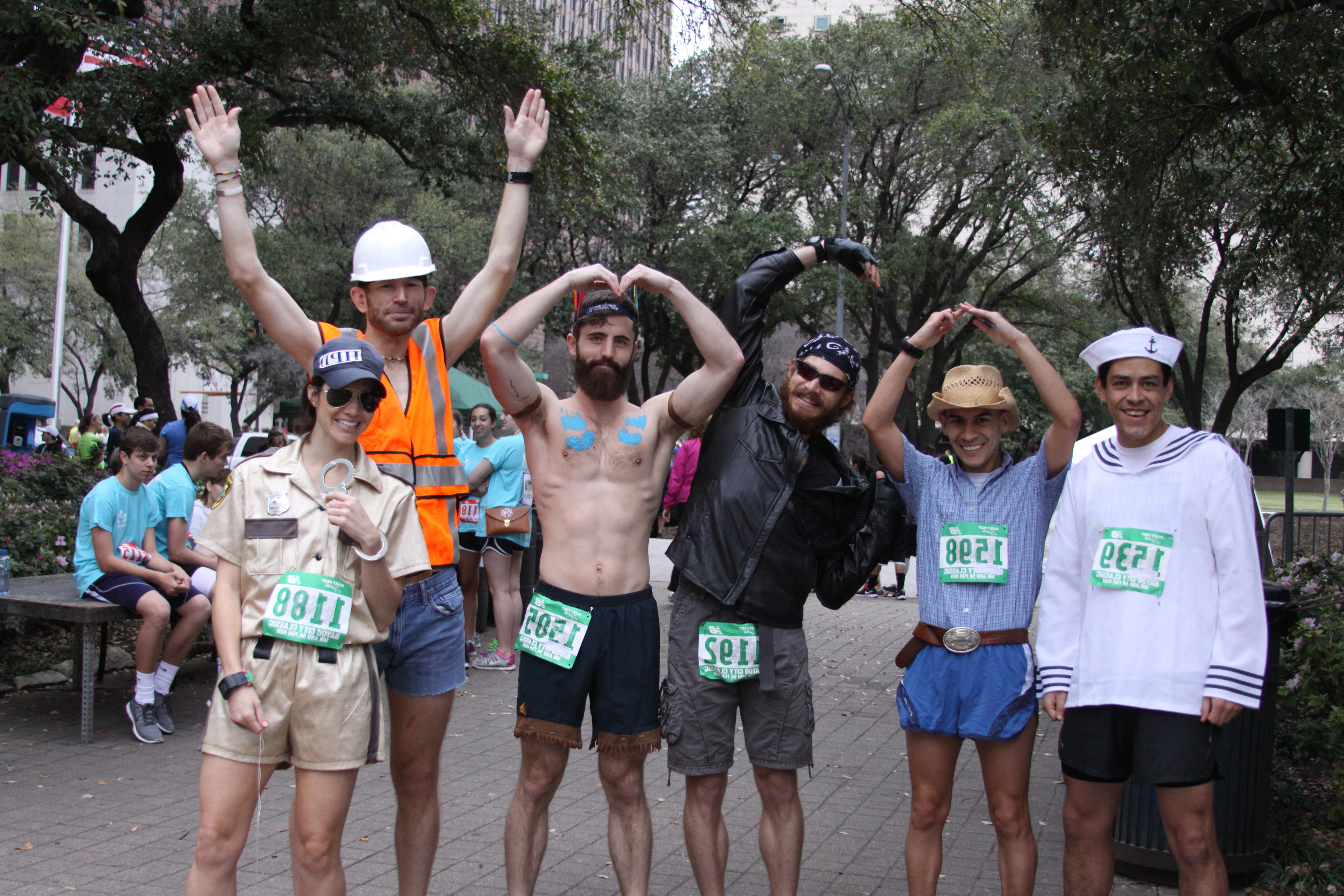 Steve Maliszewski navigated our centipede line through the streets under construction in downtown Houston. It was a fitting role for a construction worker running in jorts, a reflective vest and a construction hat. Our Indian was next in line, for which Cody Blazek put together a feathered headband, body paint markings and accented shorts to bear the likes of a bearded chieftain. Heidi Zimmerman borrowed Luis Armenteros’ (thanks!) Reno 9-1-1 outfit to run as our police officer and keep us in line. Jesus Sifuentes got lost going to the rodeo and ran as our cowboy in a hat and buttoned down shirt. Joseph Schwieterman switched out his cycling commuting outfit for a biker jacket, gloves and bandana. Rodrigo Gomez kept the end of our line afloat, running as our sailor in a white naval cap and coat.