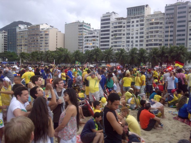 Before the start of this World Cup, I slated Germany versus Brasil for the Final match, however the bracket lined up such that they met for the semi-final match in Brasilia. Chris and I were at Fan Fest in Rio de Janeiro on Praia Copacabana to watch the match. The Scratch were without their star player Neymar who suffered a spinal injury versus Colombia in the Quarter Finals. I was divided, pulling for my ancestral home of Germany, but also Brasil being the home team. Things got crazy as a storm rolled through. We heard a clap of thunder, pop of some firecrackers, then after Germany scored their 5th goal we heard a gun shot! We all froze, looked around for 2 seconds and heard what we thought was a second shot. After the first person made a run for it, everyone followed and a few minutes of frenzy ensued with drinks flying and sand being kicked up. I think they were just shots fired in the air, but it was scary. Police are everywhere, so things settled down rather quickly but needless to say, we didn’t hang around for the second half.